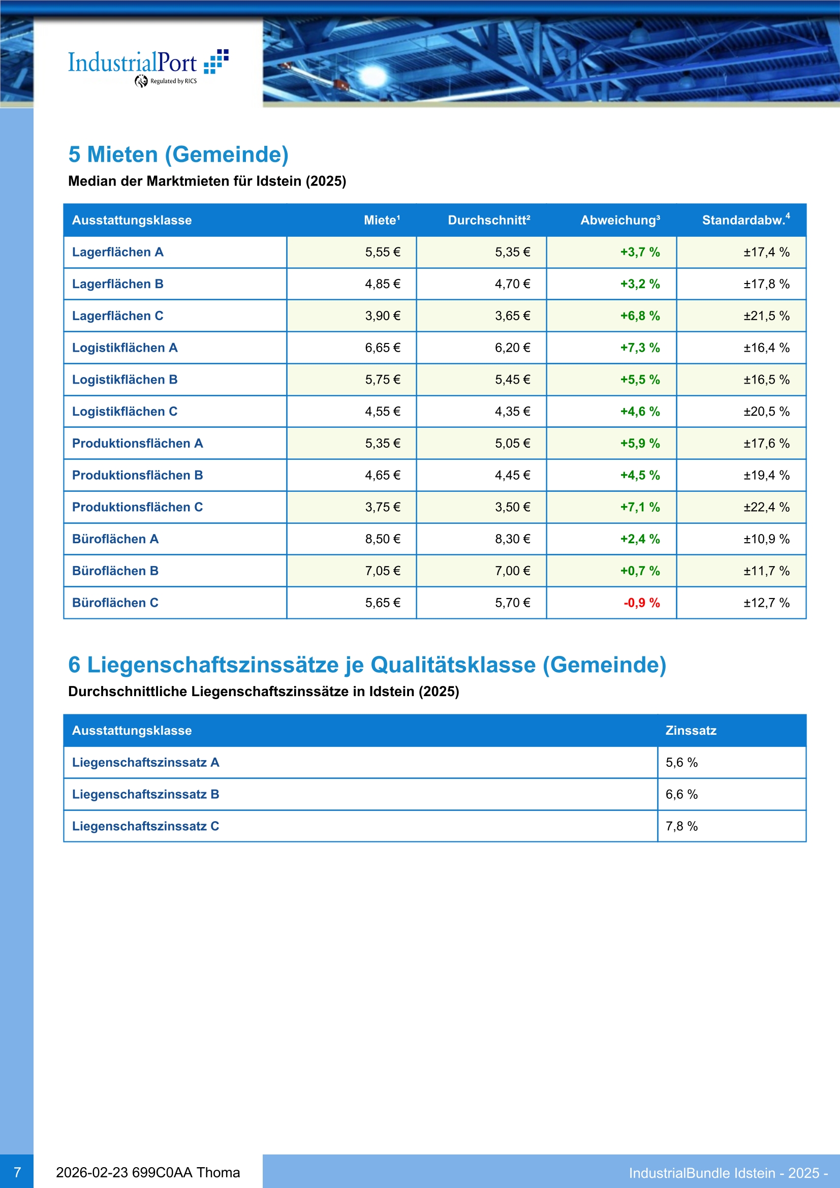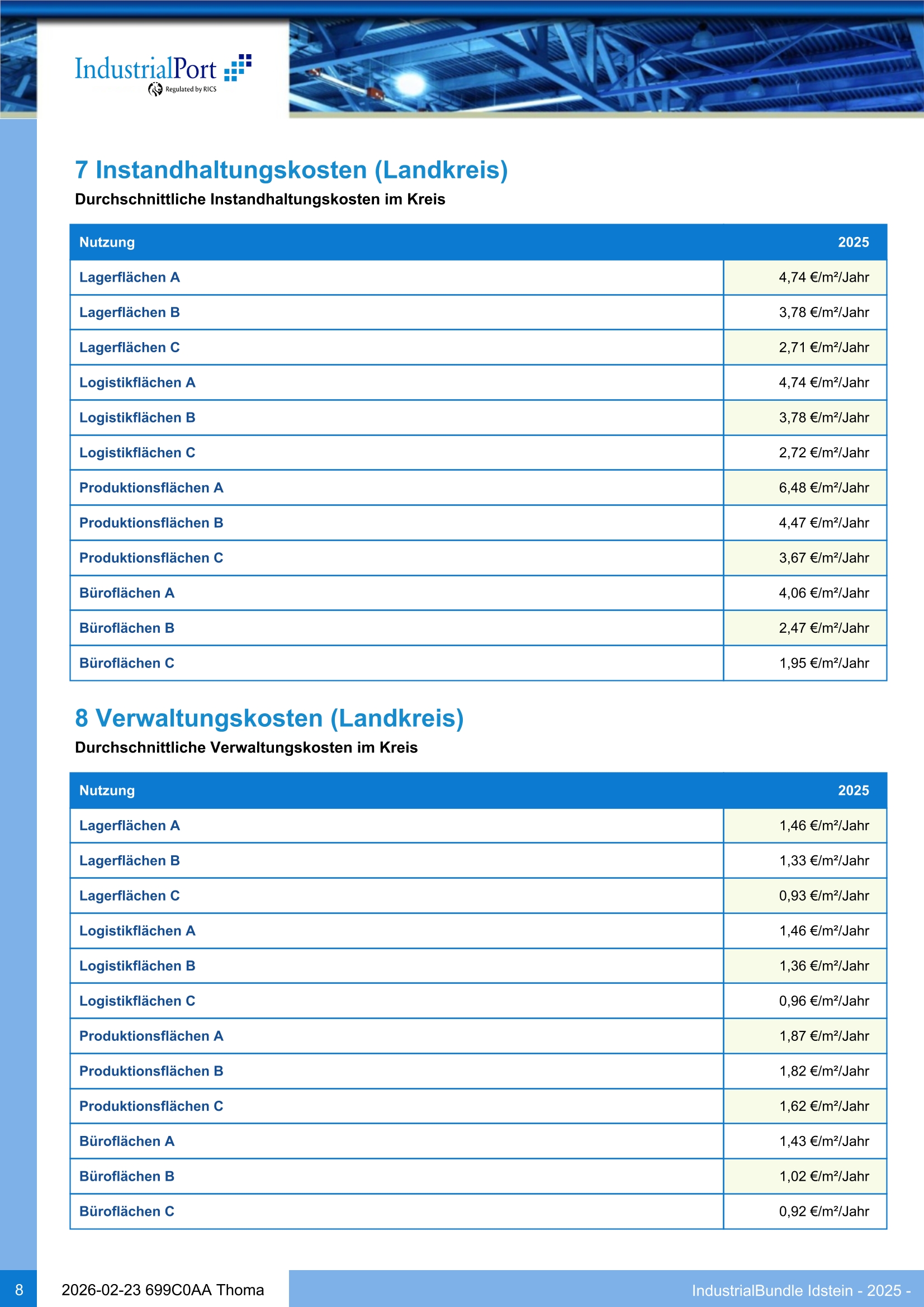 Für die Hauptnutzungsarten Lager, Logistik, Produktion sowie den dazugehörigen Büroflächen, sind alle Mieten auf Gemeindeebene ausgewiesen. Zusätzlich erfolgt eine Unterteilung nach den Ausstattungsklassen modern, funktional und einfach. Der Ausweis der aktuellen Liegenschaftszinse erfolgt auch auf Gemeindeebene. Die Verwaltungs- und Instandhaltungskosten wurden in Kooperation mit der WISAG erhoben. Sie werden auf Kreisebene ausgewiesen. Alle genannten Daten werden mit Orten gleicher Standorteignung verglichen. Die Datenbasis dieses Marktberichtes für Industrieimmobilien auf Gemeindeebene wird jährlich zum 31. Dezember aktualisiert.